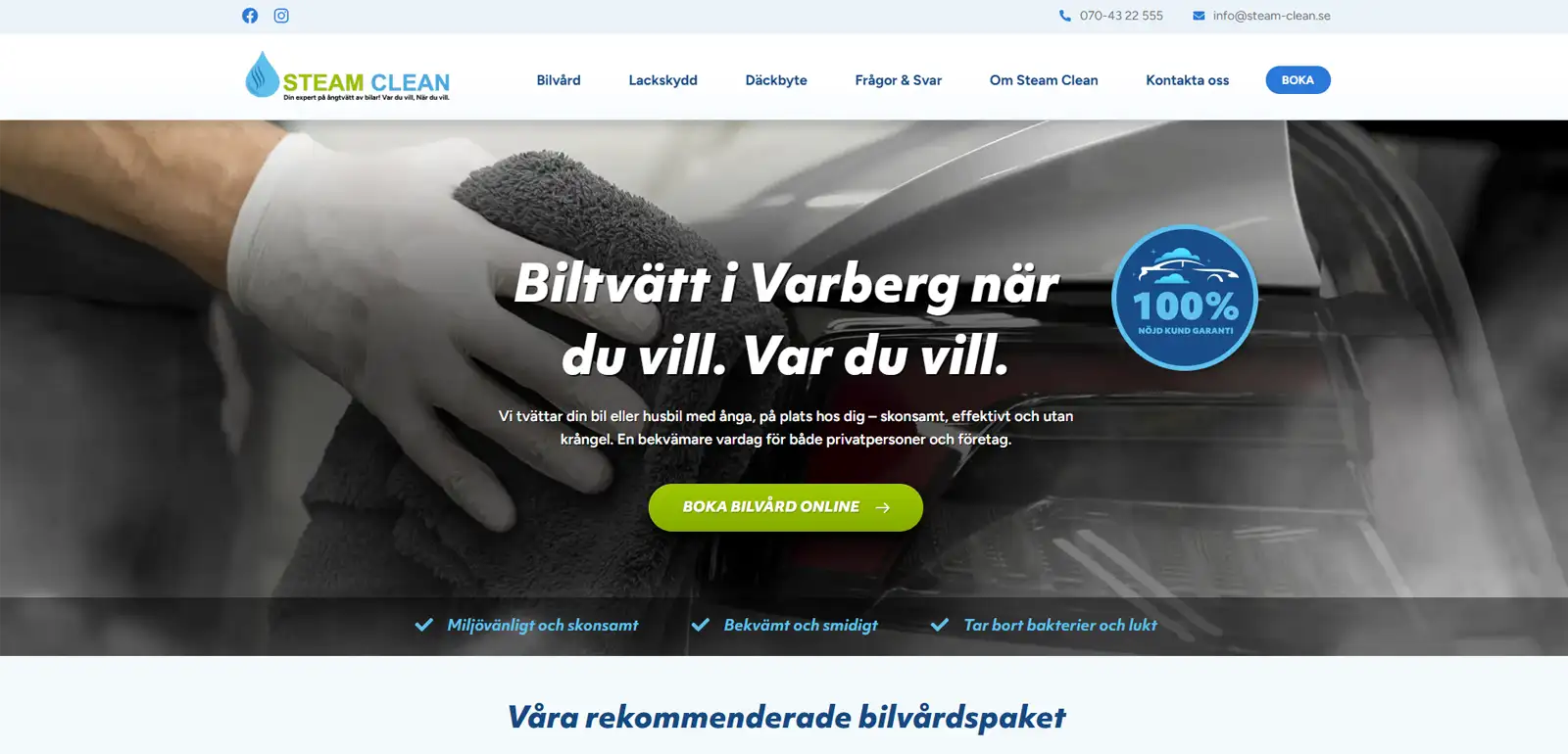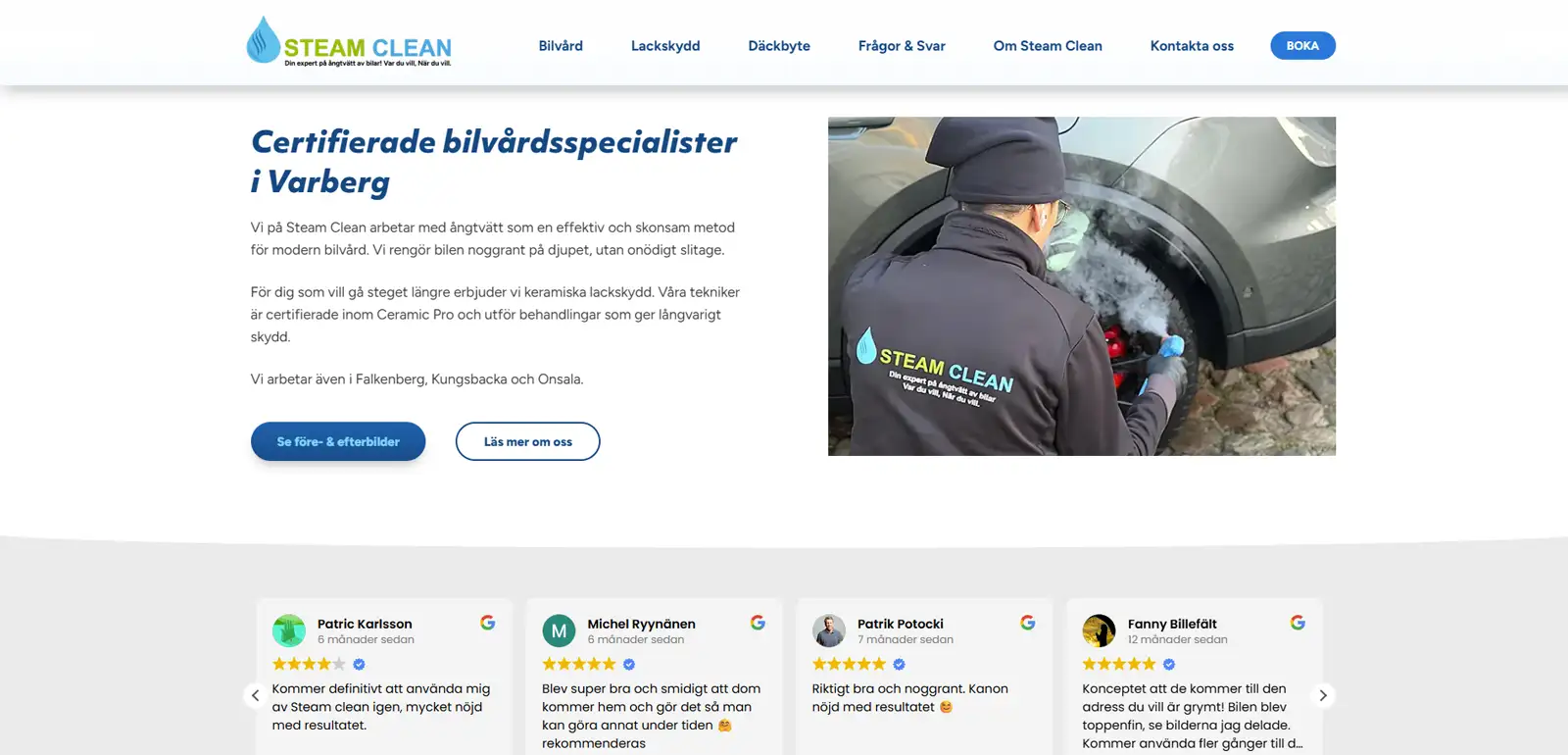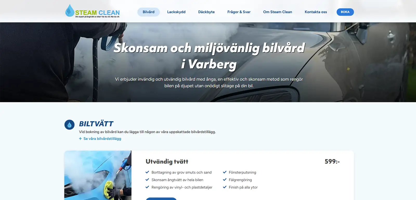 Steam Clean är ett relativt nystartat företag som erbjuder bekväm och miljövänlig biltvätt i Varberg. Fördelen med Steam Clean är att de kommer ut till dig och tvättar din bil på plats. Tack vare ångtvätten är det skonsamt mot både miljö och lacken. Behöver du rengöring invändigt också är det inga problem. Steam Clean ser till att du får en ren bil utan krångel och du slipper dessutom åka iväg från din bostad.