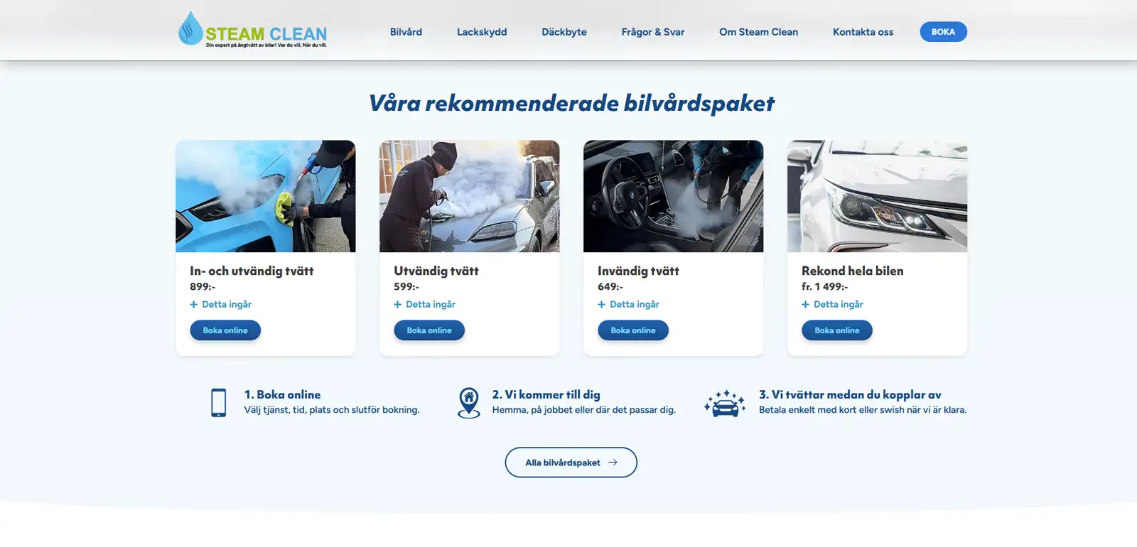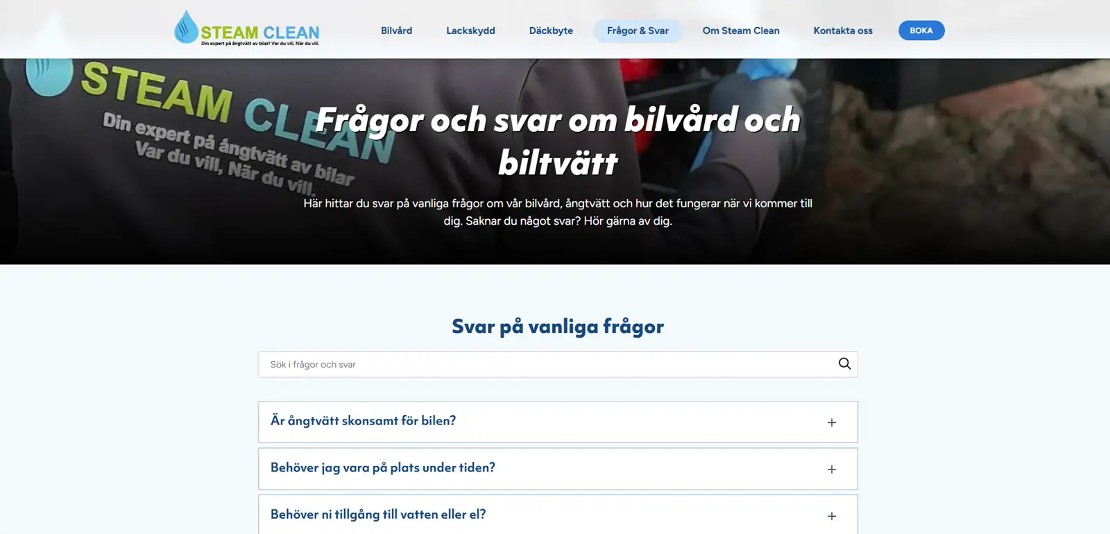 Då det redan fanns ett externt bokningssystem såg vi till att bygga en snabb och lättnavigerad hemsida i WordPress som driver trafik till bokningen. Stort fokus och energi lades på mobilanpassning då en kraftig majoritet surfar in på Steam Clean med mobilen. Genom tydlig presentation av tjänsterna samt en avdelning för frågor och svar kan Steam Clean nu fokusera all sin tid på att tvätta bilar.